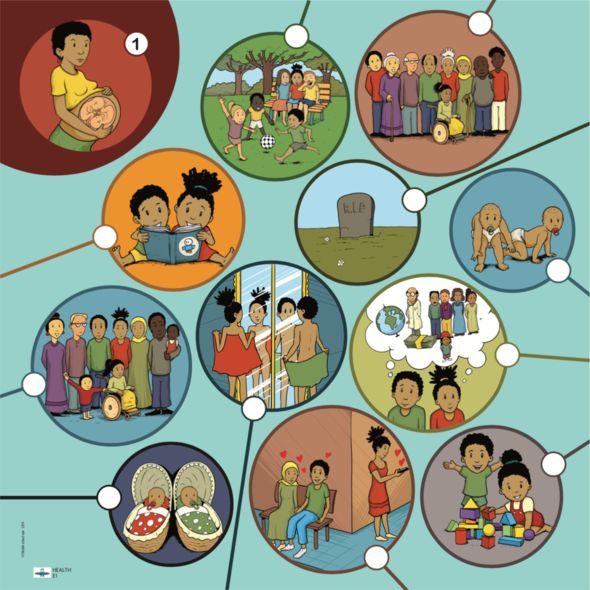 Take a couple of minutes to look at the different developmental stages on the panel, going from being a foetus in the womb until death and everything in between.