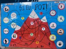 The game consists of two different rotation discs which you need to attach below or next to each other on one of the outer blackboards of the mobile school. One disc contains different objects (books, fruits, plants, animals etc…). The other disc contains