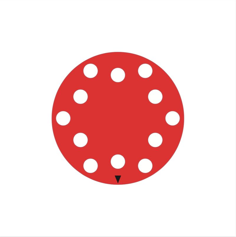Attach the disc to a panel with a split pin. Make sure the side with the arrow is on top, so the arrow is visible. You can now see all possible answers in the yellow circles while spinning the rotation disc!