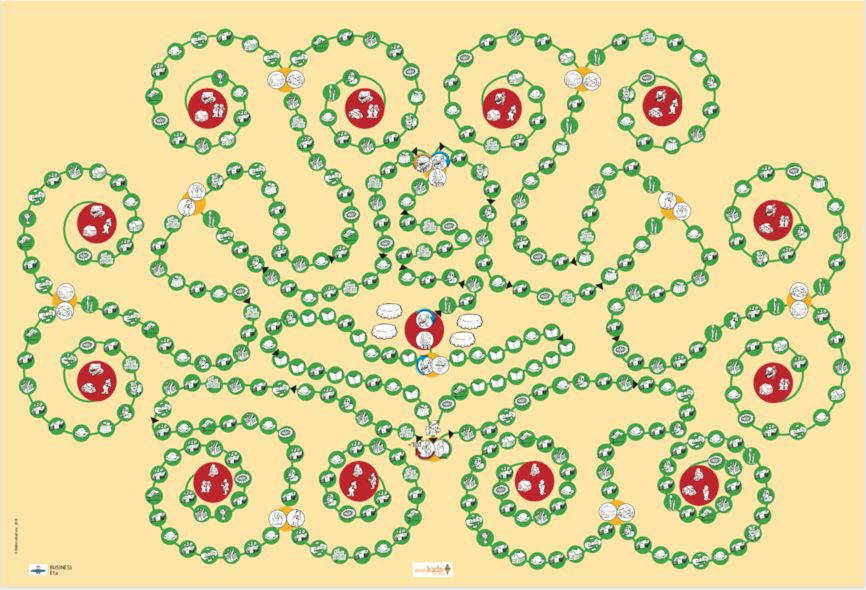 In the middle of this board game you see a red circle as the starting point of the game. On the sides, there are 12 possible ending points in red circles. The yellow circles are the road between the beginning and the ending of the game.