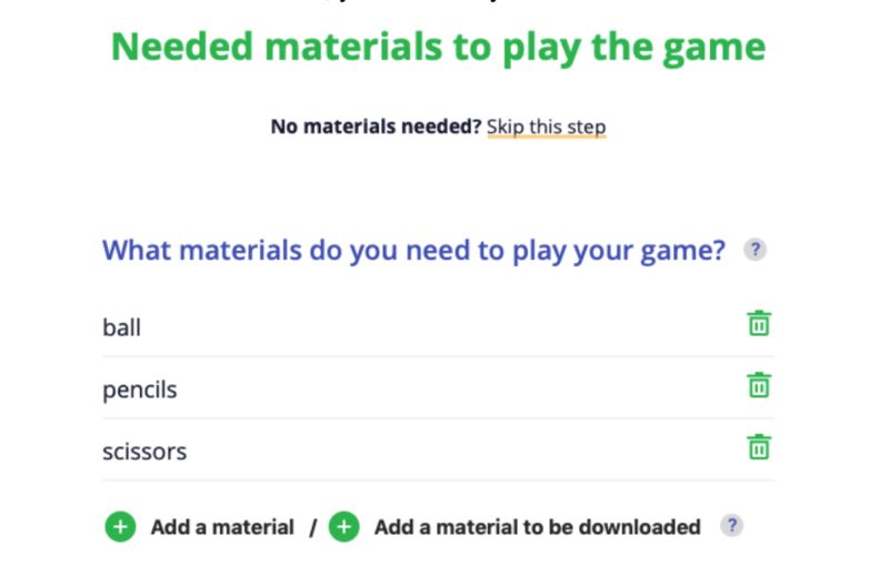 Especially for the self-made materials, include all the materials users will need to create your game.