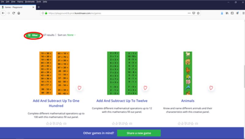 If you are looking for a particular type of game or activity, you can use the `Filter` function of the platform by following the next steps.