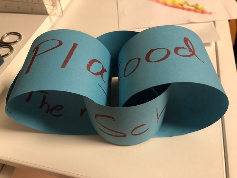 Cuando todos estén listos, hacen una cadena con todos los trozos de papel: hacen un círculo con un primer trozo de papel y conectan las dos esquinas con una grapadora. Conectan este "anillo" a otro papel pasando este segundo papel a través del primer anillo y cerrándolo con una grapadora. Continúan de esta manera hasta que todos los papeles estén conectados.