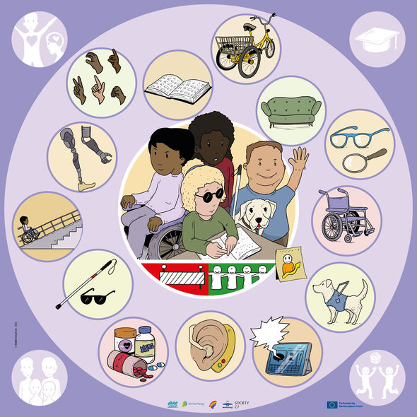Herramientas en el cartel: silla de ruedas, rampa para silla de ruedas para acceso al edificio, bastón ciego + gafas de sol, perro de asistencia/terapia, medicinas, libro Braille, computadora/tableta del habla, audífono, lenguaje de señas, triciclo, anteojos/lupa, prótesis de pierna/brazo, sofá/soporte.