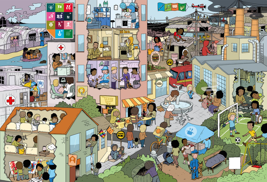 The 'Basics of Life' poster is the overview poster for the right to survival. This poster depicts different ways of access to basic needs like food, health or housing. It's one of the four storytelling posters linked to one of the dimensions of children's rights: survival, protection, development and participation. The storytelling poster is closely linked to the Basic Needs Bingo (see further).
