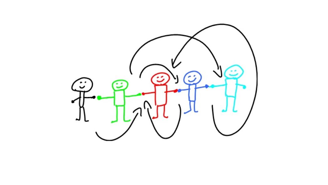 All players form a chain by giving hands to each other. The first player in the chain will step away from the others and closes his eyes.