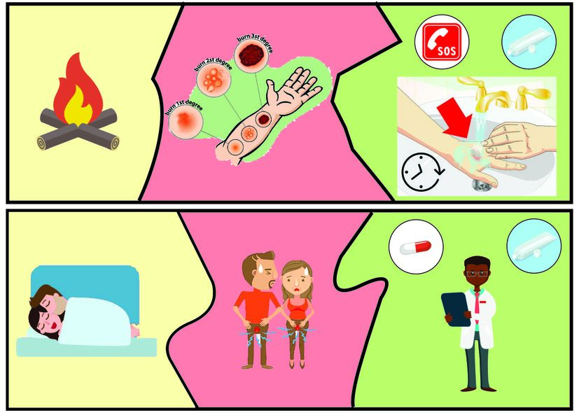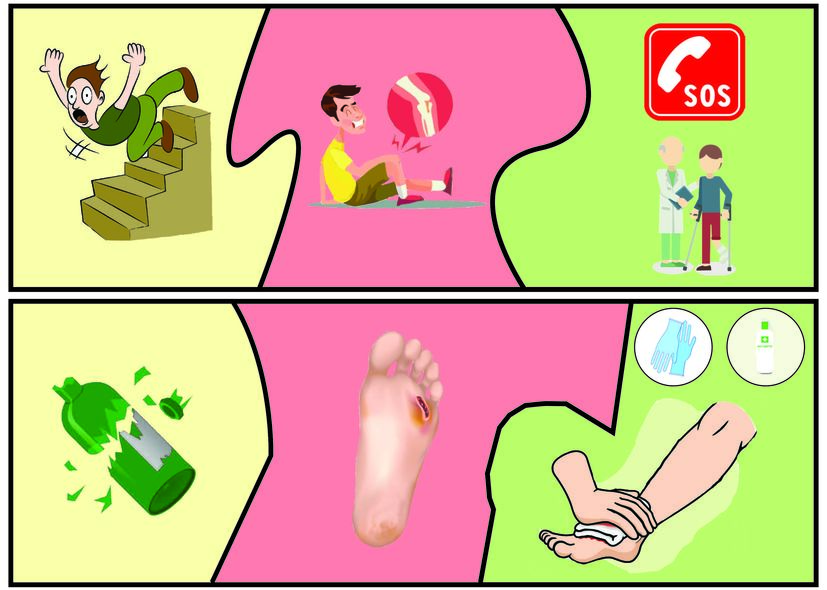 Group the different causes, injuries and first aid solutions in 3 piles.