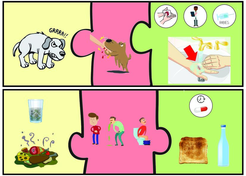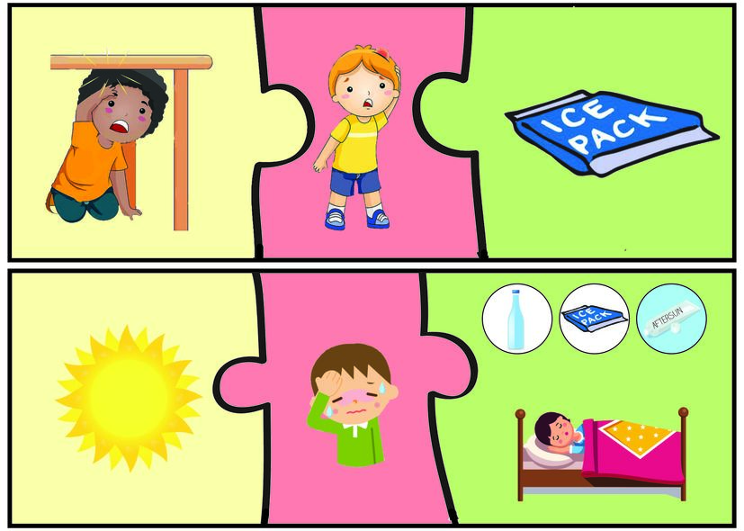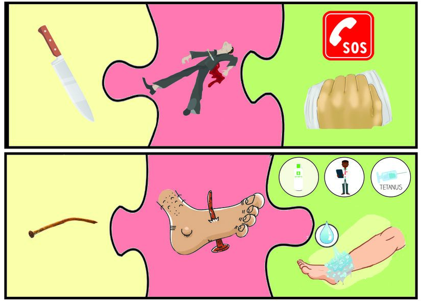 • Print the different puzzle pieces (see attachment) on coloured paper: the possible causes of an injury (yellow), the possible injuries (red) and the possible first aid solutions (green).