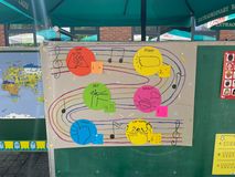 Now he has to throw his pebble in the right coloured circle. So if he took a blue pebble from the Colour Monster, he has to aim to the blue part of the circle.