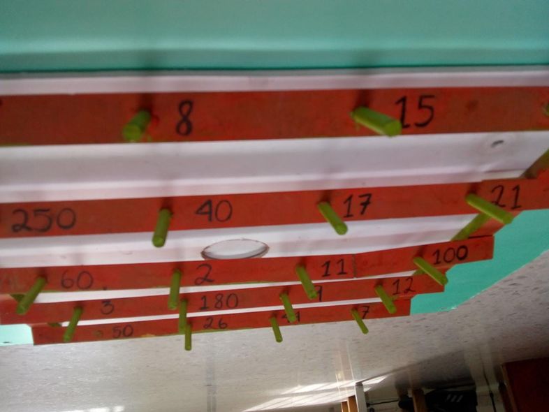Faire 5 perforations avec le foret / foret du diamètre des bâtons dans chaque bande de bois en laissant une distance de 5 cm au bord puis entre chaque bâton en bois une distance de 8 cm, en laissant à la fin également une distance de 5 cm.