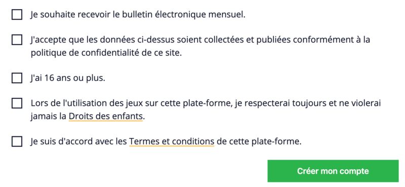 Avant de créer votre compte, vous devez confirmer que vous nous autorisez à collecter et à publier les données fournies conformément à la politique de confidentialité du site Web et que vous avez au moins 16 ans.