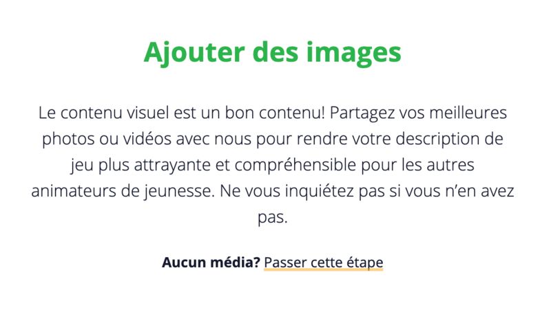 Cliquez sur ‘Suivant’ pour télécharger les images et passer à l’étape suivante. Vos images sont incluses dans le jeu! Pas de photos de votre jeu ? Vous pouvez toujours appuyer sur le bouton ‘Passer cette étape’. Si vous ne téléchargez pas d’image, une image standard apparaîtra dans la fonction de recherche et sur la page de jeu.