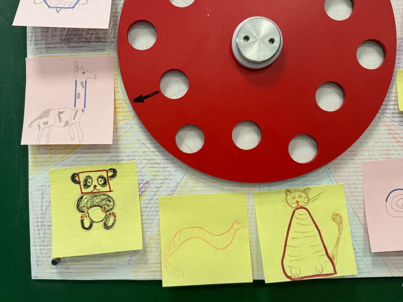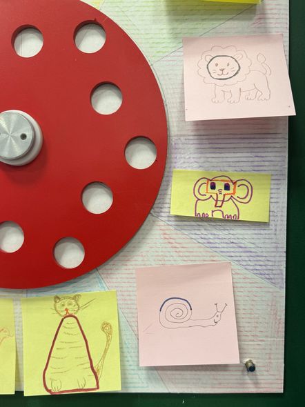 Plak kleine vierkantjes papier of Post-its rond de rand van het wiel – elk met een tekening (zoals op je foto: leeuw, olifant, kat, slak, enz.). Deze kunnen dieren, vormen of uitdagingen voor de spelers voorstellen.